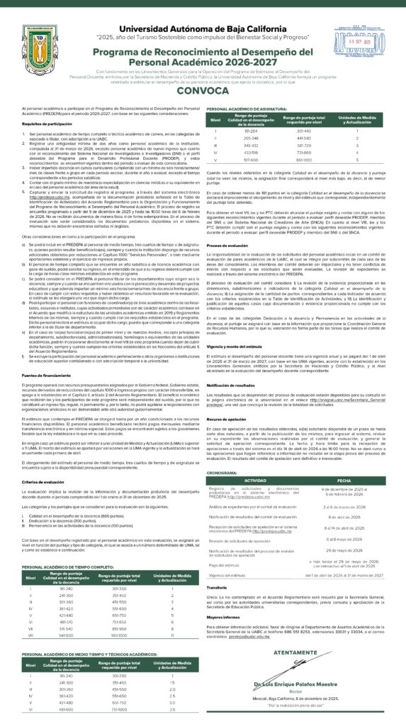 Estimadas y estimados profesores de la Facultad de Ciencias Administrativas y Sociales (FCAyS) les informamos que el sistema electrónico de registro para el Programa de Reconocimiento al Desempeño del Personal Académico (Predepa) 2026-2027 (http://predepa.uabc.mx/ ) inicia el 9 de diciembre y permanecerá abierto hasta el 6 de febrero de 2026 a las 16:00 horas.