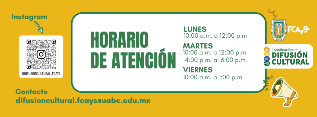 ¡HOLA CIMARRONES! Les damos la bienvenida a este ciclo 2026-1. No te pierdas las actividades de formación integral que tenemos para ti.Síguenos en nuestras redes sociales para que no se te pase ningún evento.Instagram https://www.instagram.com/difusioncultural_fcays/Facebook https://www.facebook.com/CulturalFcays/ Descarga e imprime tu CARNET para sellos. https://fcays.ens.uabc.mx/wp-content/uploads/2025/04/CARNET_UABC_FCAyS.pdf Al reunir 8 sellos en el semestre en tu CARNET, te damos 1 crédito optativo. Recuerda que los sellos no son acumulables.