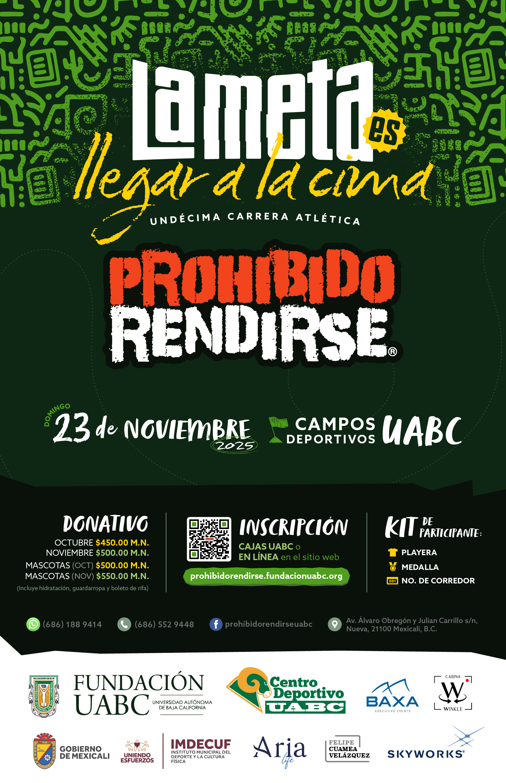 Te invitamos a la Undécima Carrera Atlética Prohibido Rendirse la cual se llevará a cabo el domingo 23 de noviembre del presente año a las 08:00 horas, en los Campos Deportivos de la UABC ubicados en Av. José Antonio Torres, Parcela 44, 21289 Mexicali, B.C.