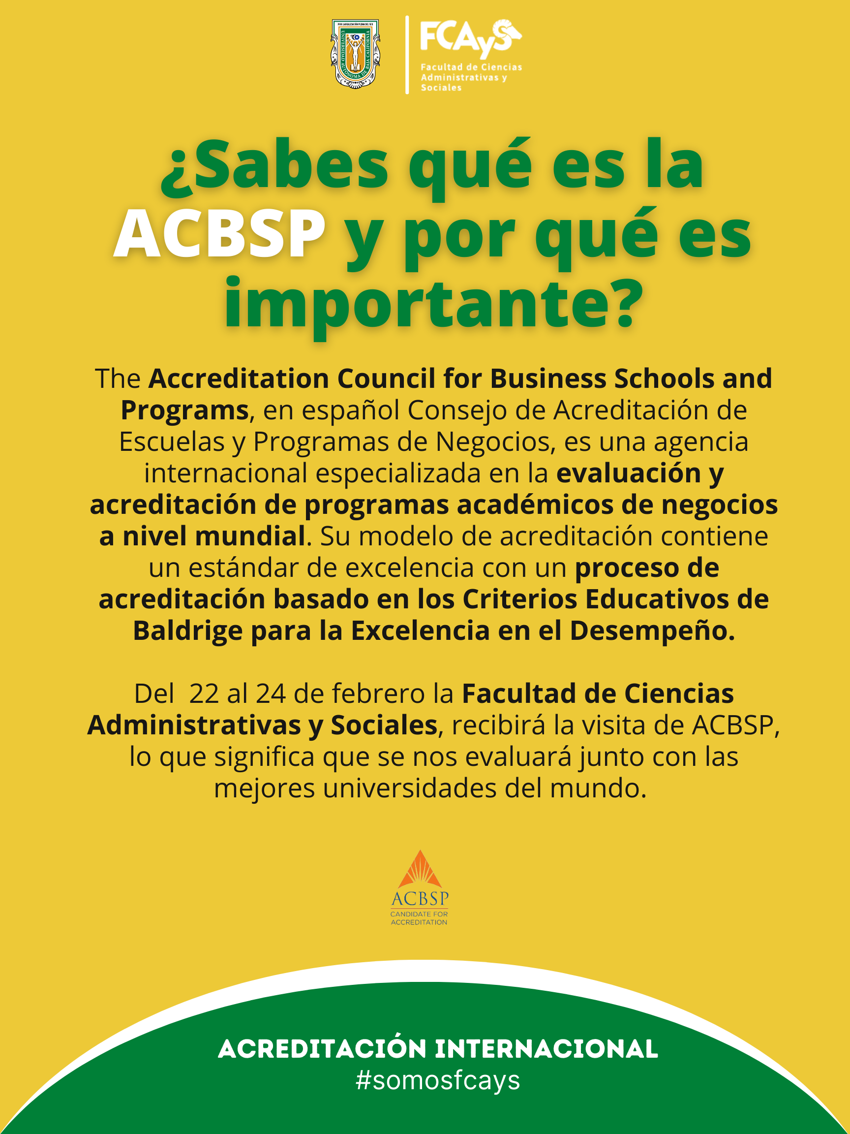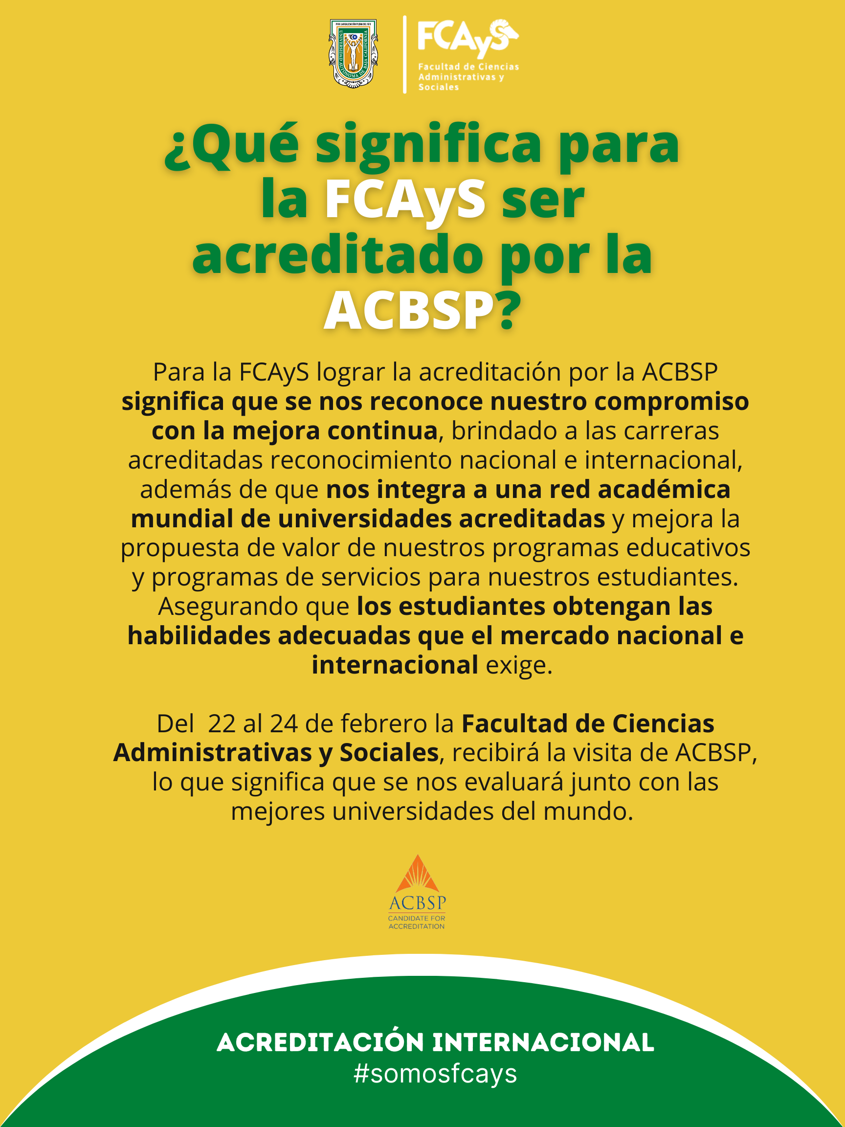 ACREDITACIÓN INTERNACIONAL Visita ACBSP-FCAYS 2023 Para más información escribir a: direccion.fcays@uabc.edu.mxINNOVACIÓN – MEJORA CONTINUA – TRABAJO COLABORATIVO #somosfcays