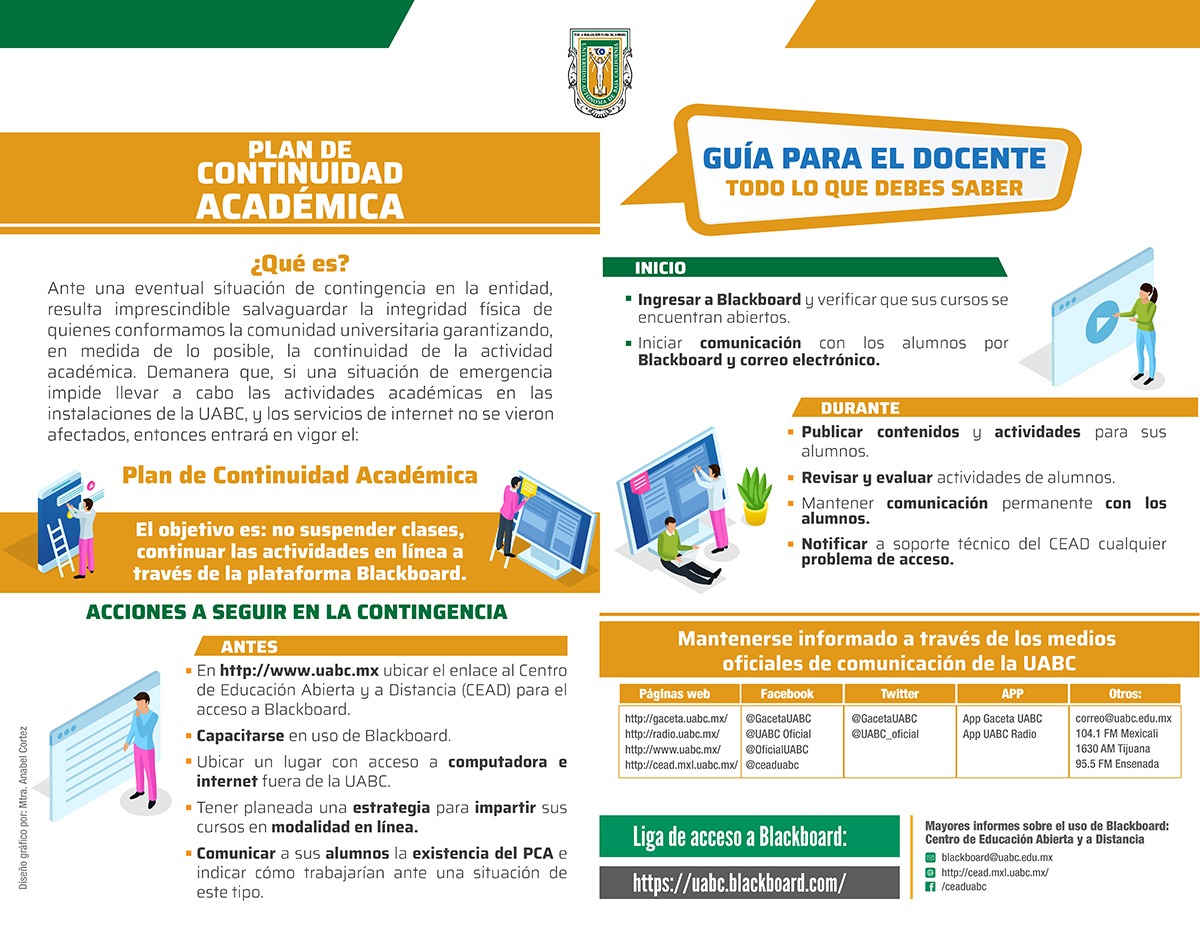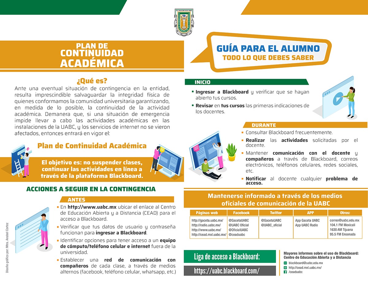 Como medidas preventivas ante la eventual aparición de casos de personas contagiadas o enfermas por el Coronavirus, se les invita a todos a no caer en pánico, y ante todo acudir a canales oficiales de información tales como la página oficial de UABC, así como sus redes sociales: